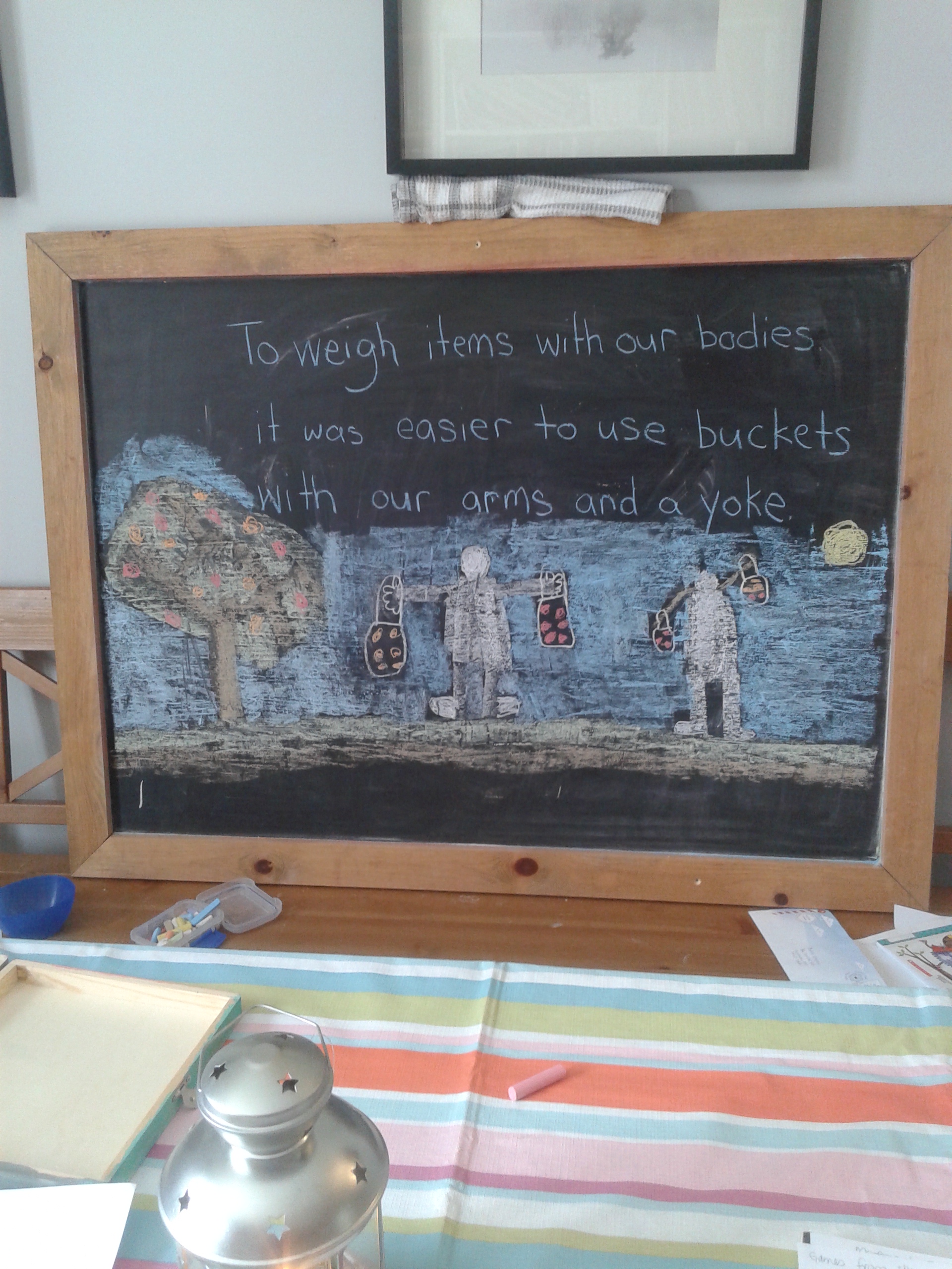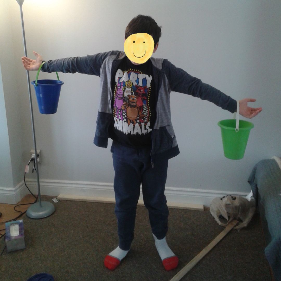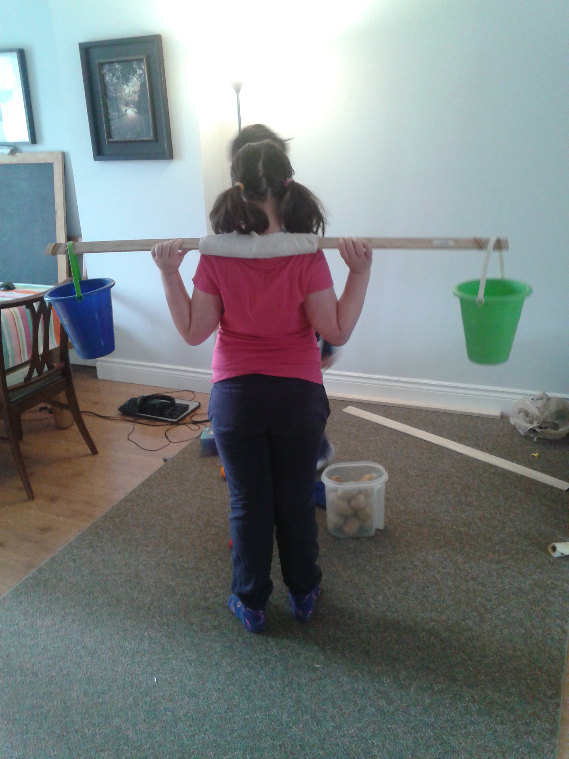 The next day instead of random objects around the house that the children collected, I placed five potatoes and five oranges on the table. The children were asked to weigh potatoes against oranges and quickly discovered hands wouldn’t cut it! They brainstormed some solutions and first tried using bowls, but found they were very difficult to keep balanced on hands. Then they thought of using sand pails. They discovered, even with the pails, it was still difficult to weigh them against each other. After some thinking they remembered the yoke they used at the Sugar Bush a few weeks back and created one with some spare lumber. The yoke worked well, but neither child knew if the yoke had been invented during the King’s time (ha ha), so they also found that using their outstretched arms and hanging a bucket on either wrist worked like a yoke in a pinch.