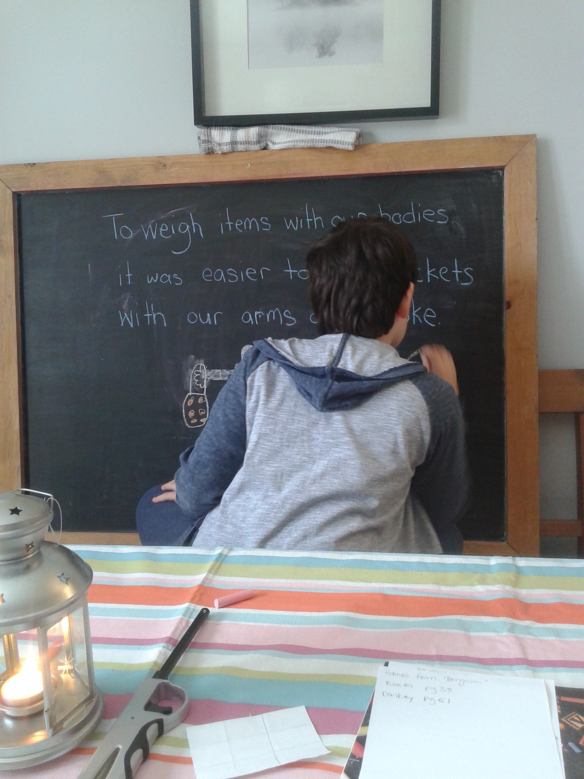 After creating a short summary of what was discovered, my eldest took over the chalkboard and created a drawing for a main lesson page. Lately, they’ve been doing all the chalkboard drawings for summaries and I love it!