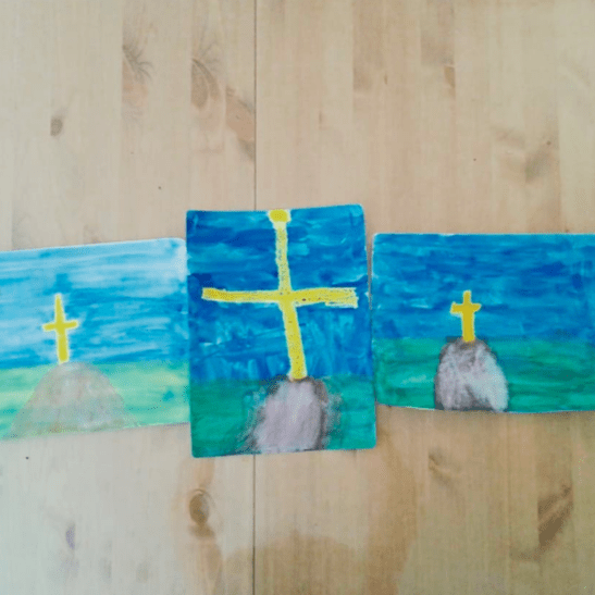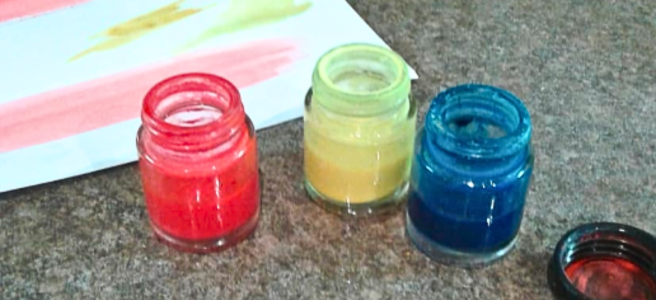 Many people wake early each day to prepare for their lessons, but the children and I wake together in the morning, so preparing in the morning doesn’t work for me. What I do instead is each evening, I will collect the supplies needed for the next day and have them ready to go. For painting that means collecting paints, brushes, paper, sponges, cloths, painting boards and a jar for each of us. We are currently reading King Arthur, and today’s painting is an oil resist of the sword in the stone. That means I’ll need to add pastel to the list of required tools.