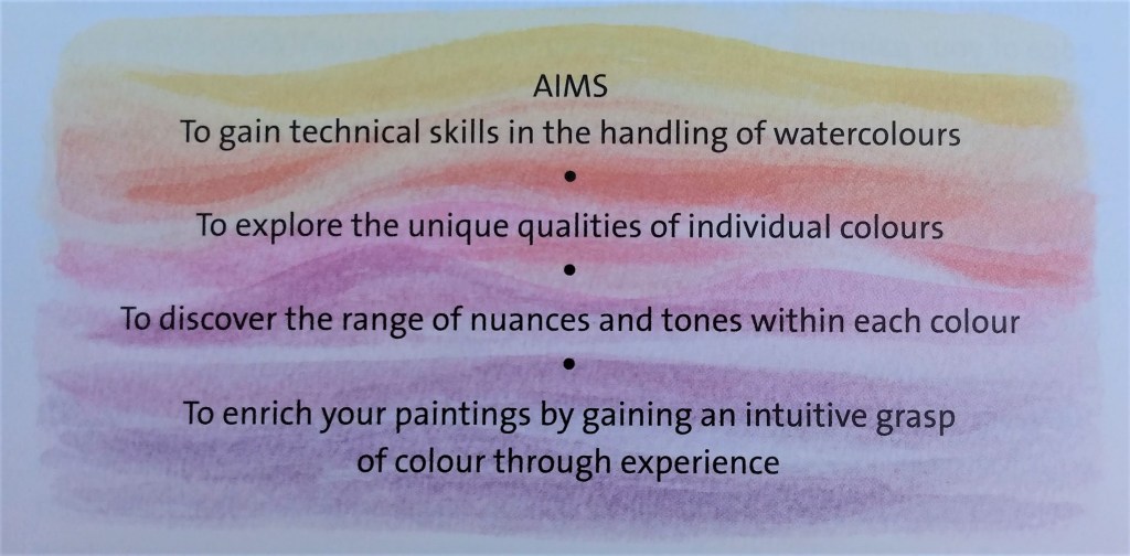 The introduction states: “This books is designed to take you on a step-by-step journey, opening a door to fresh, vital colour experiences and offering an experimental approach to water colour painting… Designed for beginners and students as well as teachers, therapists and artists, the book is structured in sections to guide you systematically, chapter by chapter, through a progressive sequence.”