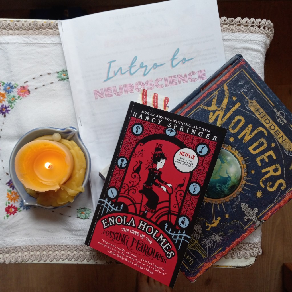 Once back from my walk, I give the main lesson reminder, which usually starts at 1pm. We all come together for main lesson. I always start this time with an exploration of some topic, and right now everyone is super interested in traveling and geography so we are looking at some hidden wonders of the world and sometimes watching a YouTube video of the location. It always sparks some great conversations. Next we work on our unit/block (we are just finishing up neuroscience) and then read aloud from our current book, which is Enola Holmes. I saved this for highschool because while it is marketed towards 9+ there are many references to prostitution and struggles of the lower class Victorians that I felt were well beyond the understanding of my children. My fourteen year old calls those bits quite “cringy”, ha ha. Main lesson time usually takes about an hour and a half. This is also the only piece in our rhythm that has changed from when they were small, when main lesson was in the morning.