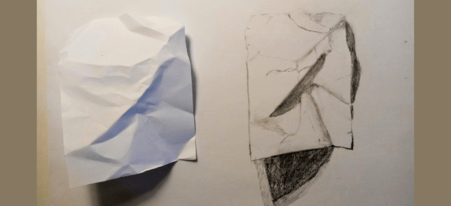 The image above is an in-progress first attempt at drawing a crumpled piece of paper. We started simply, with just a slightly crumpled sheet, and will work our way to a sheet crumpled into a ball. It’s an activity that takes time, but at the same time, must be done in one shot, because you’ll never get the light and position the same again.