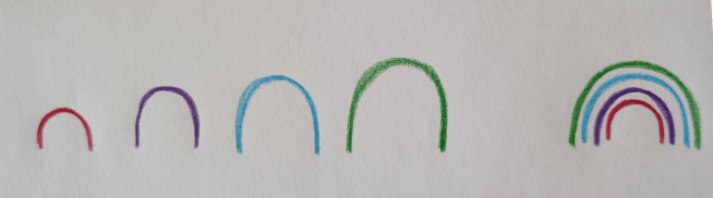 The form below was one of our first curves activities and I used the imagery of bunnies hopping. This would be a great time of year to include this in your lessons. For curves in a row, you could say the bunny family was happily eating grass when baby bunny hopped to a new spot. Then brother bunny, sister bunny and Mama/Papa bunny hopped as well. For the rainbow of curves, you could say one bunny was hopping over the other. It isn’t a long detailed story. It is only a few words to guide them to an image within the movement.